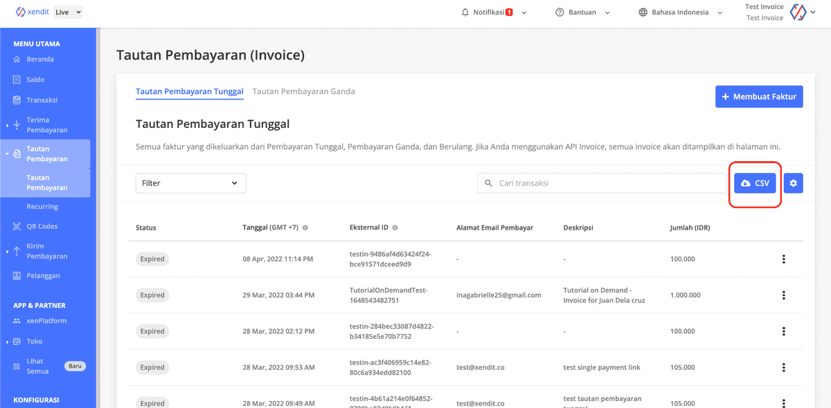 Untuk mengunduh laporan tautan pembayaran Anda, silahkan menuju tab Tautan Pembayaran di dasbor Anda dan klik tombol CSV. Kami akan mengirimkan email ke alamat email pengguna Anda yang terdaftar dengan lampiran CSV yang siap untuk diunduh