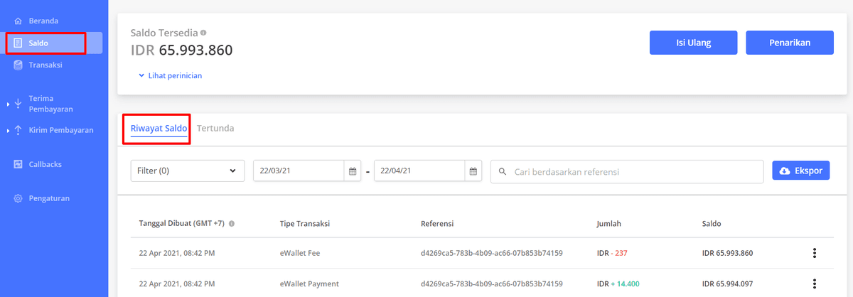 Seluruh aliran dana yang masuk dan keluar pada saldo Anda akan terekam pada tab Riwayat Saldo. Anda dapat menggunakan tab ini sebagai referensi utama aliran dana dari semua transaksi.