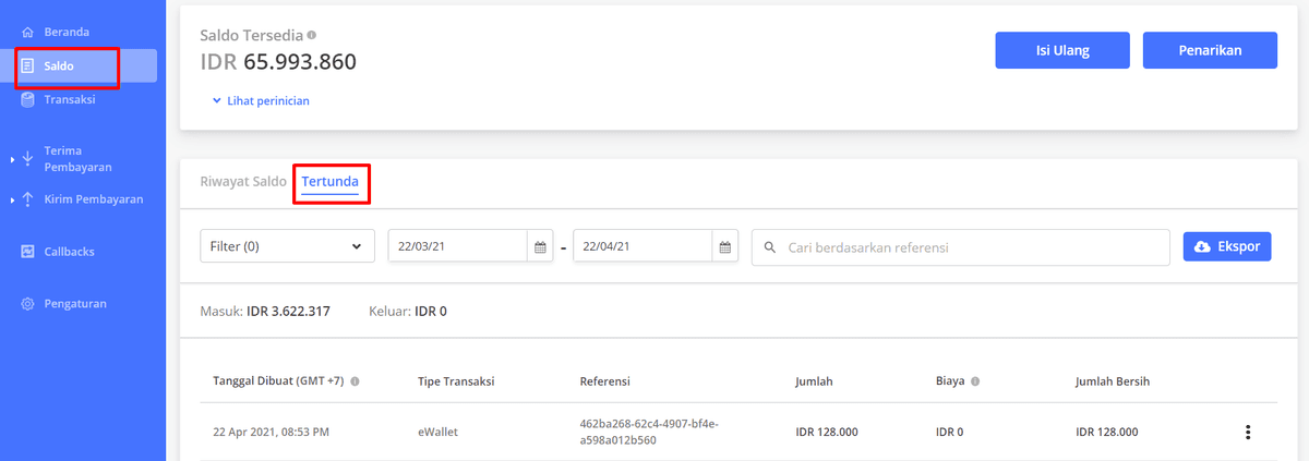 - Saldo Tersedia: total saldo yang dapat Anda tarik ke akun bank Anda atau transfer ke akun bank lainnya melalui Disbursement.