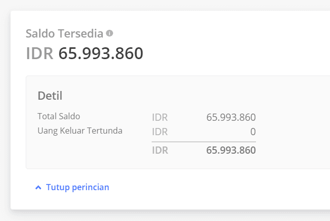 - Total Saldo: Saldo terakhir yang tersimpan pada riwayat saldo. Ini merupakan jumlah uang keluar yang tertunda dan saldo yang tersedia.